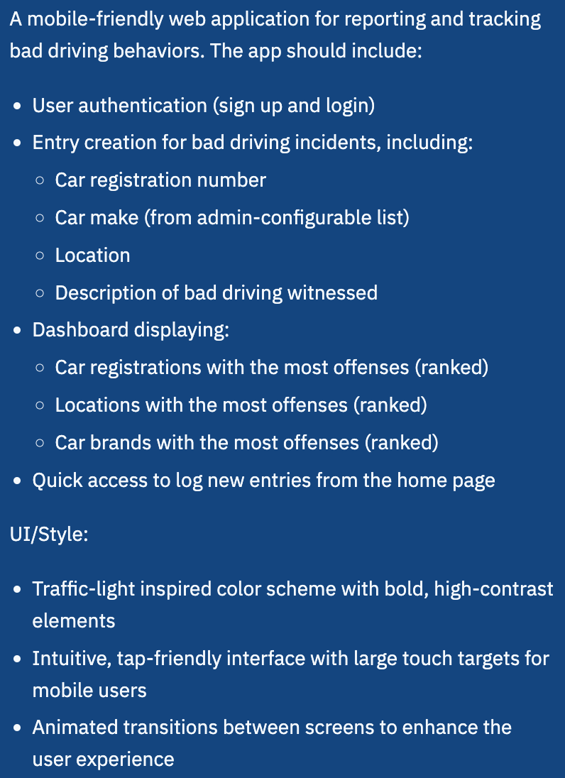 Something that I am not short on is ideas! I needed something that would not be too big scope or too complex and something that users would find interesting. I settled on a website that allows the public to report bad or selfish driving, with the view of creating awareness of road safety and a social conscience when using the roads.